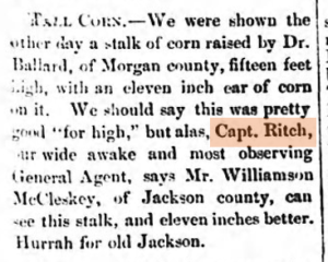 Summary: From this article, it would seem that Jerry is calling BS on someone’s claim of tallest corn, instead contending that there’s taller corn in neighboring Jackson County. His travels on horseback around the area as newspaper general agent would have given him great insight into “tallest.”